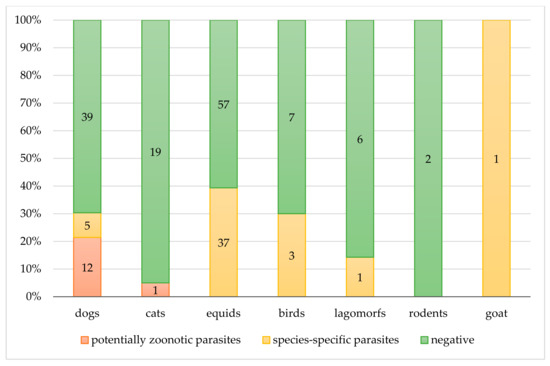 Figure 3. Copromicroscopic results. Distribution of negative and positive (zoonotic or species-specific) results in each animal species.