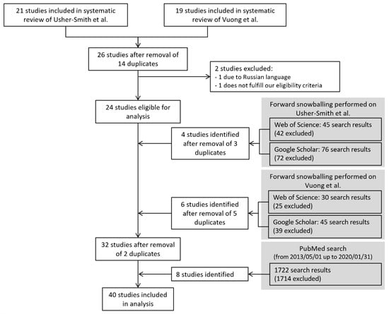 Altogether, 24 of the 26 studies [,,,,,,,,,,,,,,,,,,,,,,,] from the two systematic reviews [,] were included in our analysis. Eight further studies were identified via forward snowballing [,,,,,,,], while eight studies were found in PubMed [,,,,,,,]. Therefore, we included 40 studies in our analysis (Figure 1).
