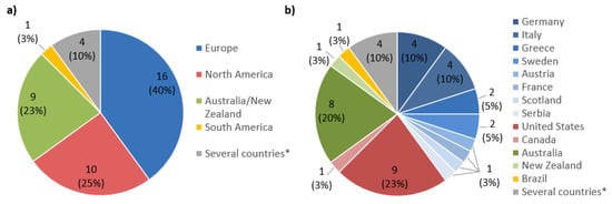 Geographical location of studies. (a) Distribution of studies according to the continents of their origin. (b) Distribution of studies according to their country of origin. (n = 40 studies). * Four studies used data sets from multiple countries with high melanoma incidences for the development of their risk prediction model.
