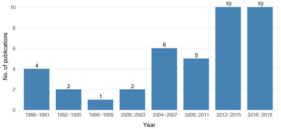 The temporal distribution of the reviewed studies is shown in Figure 3. The most recent time intervals, 2012–2015 and 2016–2019, show the highest numbers of publications (n = 10 each). In fact, half of the studies were published in those eight years, while the remaining 20 studies are spread over the larger time period from 1988 to 2011.