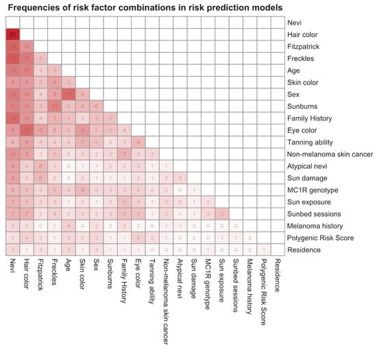 Figure 4 displays the frequencies of risk factor combinations as a heatmap. This figure only contains those 20 risk factors that appear in more than two of the risk prediction models. A plot with all 35 risk factors can be found in the Supplementary Figure S1. The most common predictor combinations are nevi and hair color (n = 21, 47%), followed by nevi and freckles (n = 15, 33%) and nevi and Fitzpatrick skin type (n = 14, 31%).