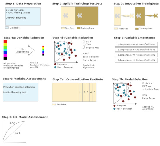 Figure 1. Data processing and statistical analysis. Step 1—Data preparation: Variables with more than 33% missing values eliminated; multiple categorical variables one-hot encoded; continuous variables not manipulated. Step 2—Data split: Split in training dataset with 70% of cases and test dataset with 30% of cases. Step 3—Imputation: Training and test dataset separately imputed via multivariate imputation by chained equations (MICE). Step 4a,b—Variable reduction: Identification of most influential variables in training dataset via different machine learning algorithms. Step 5—Variable importance: Variables ranked in order of importance, based on the number of times identified as most important by machine learning algorithms. Step 6—Variable assessment: Check for multicollinearity and selection of predictor variables identified at least 3x by algorithms. Step 7a,b—Model selection: Calculation and selection of best machine learning algorithm with identified predictor variables on test dataset embedded in 5-fold cross-validation. Step 8—Model assessment: Accuracy, area under the curve (AUC), sensitivity, specificity, positive predictive value (PPV), negative predictive value (NPV), extraction of best model.