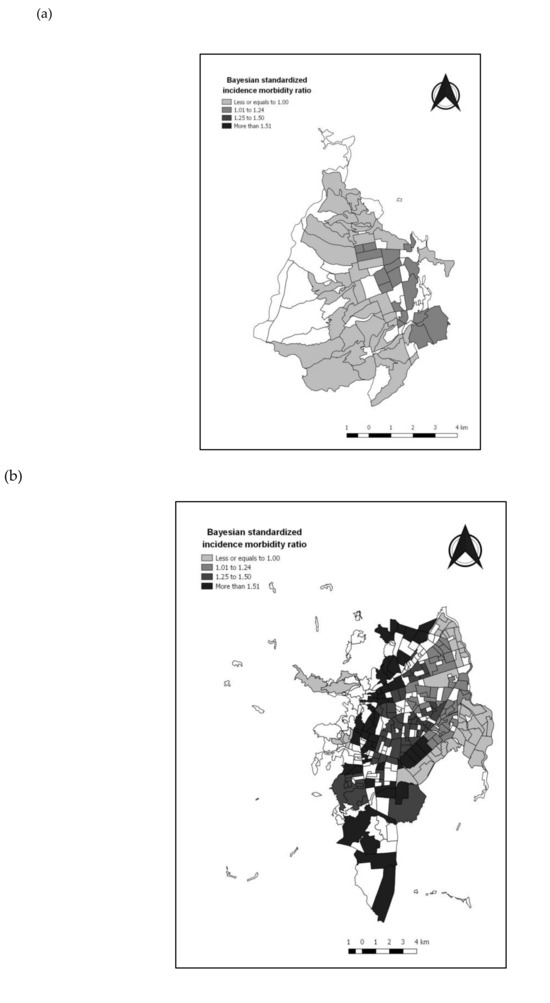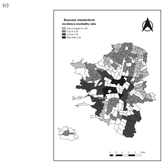 Bayesian smoothed rates of acute childhood leukemia in urban sectors of three capital cities, Colombia 2000–2015. (a) Bucaramanga; (b) Cali; (c) Medellín.