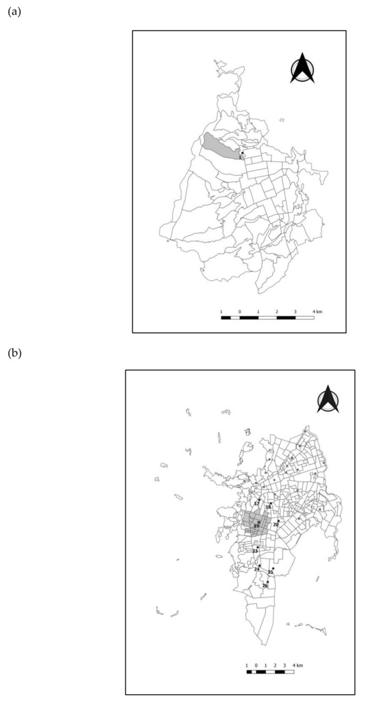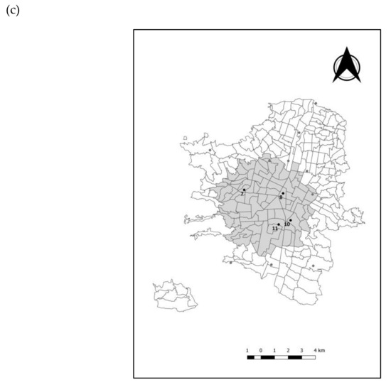 Localized spatio-temporal clusters of acute childhood leukemia and industrial conglomerates in urban sectors of three capital cities, Colombia 2000–2015. (a) Bucaramanga; (b) Cali; (c) Medellín. Note: industrial conglomerates are shown as points and the conglomerate’s numbers are presented only for conglomerates with statistically significant result in cluster analysis.