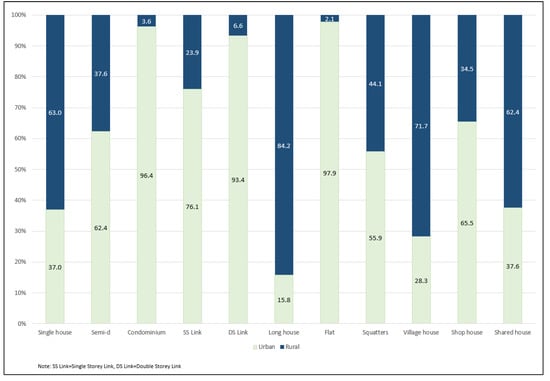 Of the 7978 LQs, 58.3% were in urban areas. All house types were seen in both urban and rural areas, including long houses and village houses (Figure 1).