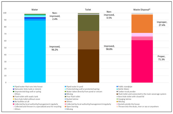 Almost all LQs had improved water sources and toilet types, while two thirds of the LQs had proper domestic waste disposal (Figure 2). A common improved water source was piped water into the house (89%), while the frequently found improved toilet type was a flush toilet connected to a main sewerage system (48.0%). In turn, the common domestic waste disposal method was local authority/management collection (65.7%) (Appendixe A, Appendixe B, Appendixe C).