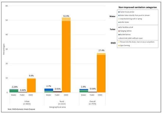 Descriptive analysis was conducted to determine the relationship between sanitation with each socio-economic variable. Binary logistic regression was performed to identify the factors associated with non-improved water sources, non-improved toilet types and improper domestic waste disposal. The enter method was used in the logistic regression analysis and the odds ratio (OR) with 95% confidence intervals of the OR (CI) reported.