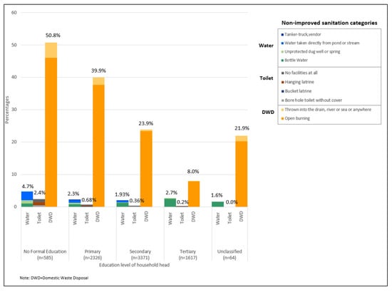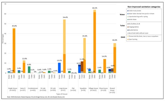 No differences were observed between urban and rural locations for water sources and toilet types. However, improper domestic waste disposal methods, mainly open burning, was higher in rural LQs (51.9%) (Figure 3). Water sources was a problem for long houses (10.5%), squatters (8.5%) and shared houses (4.0%) (Figure 4). Non-improved toilet types were 11.9% for squatters and 4.8% for shared houses (Figure 4). Improper domestic waste disposal practices were higher in village houses (64.2%), long houses (54.4%), single houses (45.8%) and squatters (35.6%) (Figure 4). An increase in education or income levels showed a decrease in improper domestic waste disposal methods (Figure 5 and Figure 6).