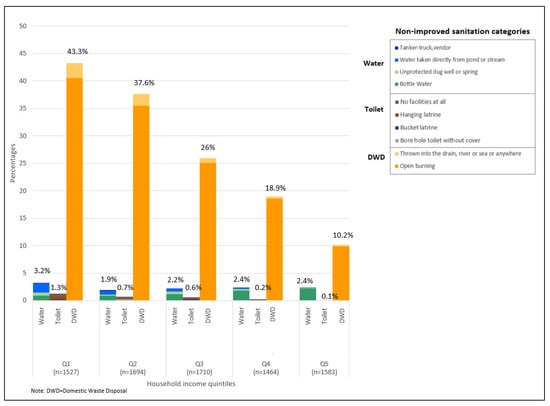 Cross tabulations were run between the types of water sources, toilets and domestic waste disposal used by the LQs with the demographic characteristics of the household heads. The socio-economic factors included were household income quintiles, where Q1 is the poorest 20% and Q5 is the richest 20% of the population; education level; geographical location; and house type. The data was processed using Epi Info software, version 21, and analysed using Statistical Package for the Social Sciences (SPSS) (IBM Corp., Armonk, NY, USA), version 22.