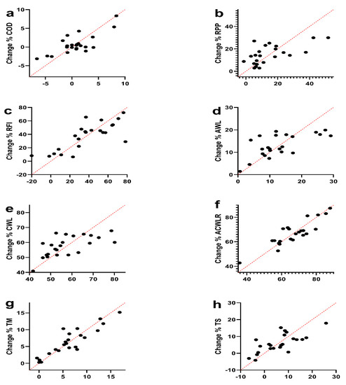 Multiple linear regression analysis was calculated to predict the percentage of change in fitness levels {i.e., COD (seconds), anaerobic power variables (watts), and workload parameter (A.U.)} based on accumulated WL parameters, baseline fitness levels, and PHV soccer player (Table 3 and Figure 3). The first analysis in COD showed that there was no significance (F (12, 10) = 1.17, p = 0.41), with R2 of 0.58. Participants showed poor predictions for COD (Y) is equal to Beta0 + Beta1 (PHV) + Beta2 (Maturity offset) + Beta3 (EaS of COD) + Beta4 (EaS of RPP) + Beta5 (EaS of RMP) + Beta6 (EaS of RAP) + Beta7 (EaS of RFI) + Beta8 (EaS of AWL) + Beta9 (EaS of CWL) + Beta10 (EaS of ACWLR) + Beta11 (EaS of TM) + Beta12 (EaS of TS) where PHV and maturation status was coded or measured as years, fitness status was coded or measured as seconds, and watts and WL parameters were coded or measured as A.U. in order based on the equation. Additionally, the analysis in RPP and RFI demonstrated there was no significance (F (12, 10) = 0.52, p = 0.86) and F (12, 10) = 1.3, p = 0.36) with R2 of 0.38 and 0.60, respectively.