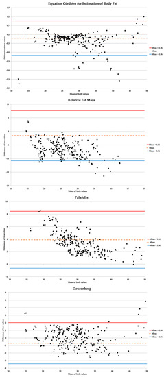 Our study indicates that ECORE-BF shows a high concordance with CUN-BAE, a widely used method to estimate body fat percentage in the general population. The estimation and distribution of body fat have been widely studied, mainly because of its involvement in the development of various chronic diseases [23]. In this context, several formulas based on anthropometric measurements have been developed to replace more complicated and expensive tools [13,14,15].