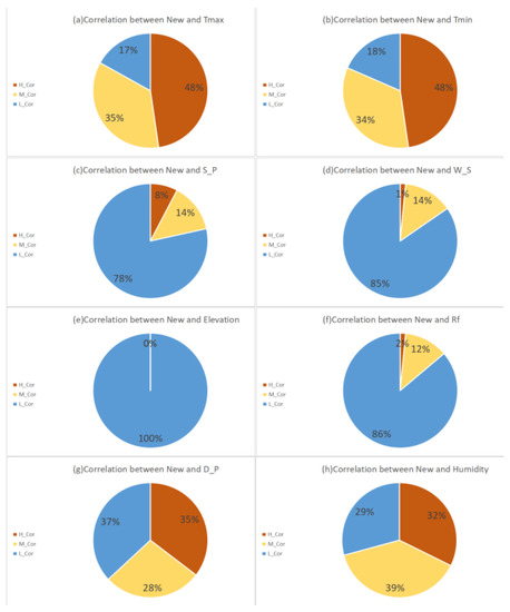 - There is a low correlation between the New and Rainfall overall. There are only 9 countries where the New and Rainfall show medium or high correlations, accounting for about 14%. Among them, there are 1, 8, and 56 countries showing high, medium, and low correlations respectively, accounting for about 2%, 12%, and 86% respectively, as shown in Figure 4f.