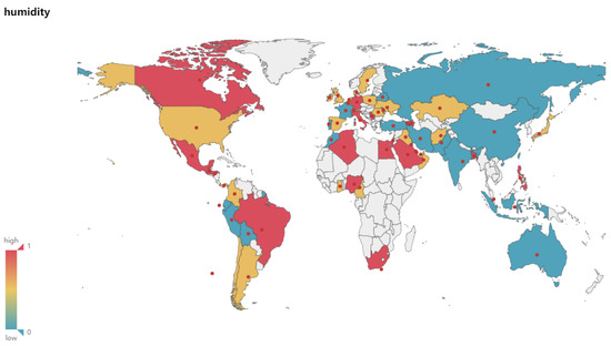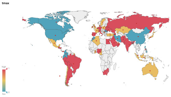 Figure 3, Figure 4, Figure 5 and Figure 6 show the maps of the correlation between New and Tmax, Tmin, Relative Humidity, verifying and demonstrating the analysis and inference above on the whole. In the maps, red color indicates high correlation, yellow color indicates medium correlation, and blue-green color means low correlation, while white color means unselected countries. We select most countries in the world for analysis, trying to reveal the impact of various climate factors on the activity of COVID-19 in the global range, and effectively reduce the risk of erroneous conclusions because the occasional weather conditions in individual countries are similar to the climatic conditions related to virus activity, so that the experimental results are more reliable and universal. Integrating with the spatial visualization analysis in Figure 3, Figure 4, Figure 5 and Figure 6, we further analyze and infer the following points of view: