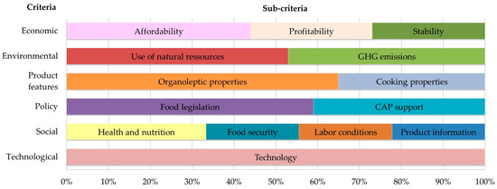 Weights of the different sub-criteria are shown in Figure 5 (all stakeholder’ views together) and Table A1 (by type of stakeholder group). Results indicate that, for all stakeholders, affordability is the most important economic sub-criterion (representing 44% of the total mean economic weight), followed by stability and profitability (both approximately 27%–29%). Regarding the environmental domain, the most important sub-criterion is use of natural resources (53% of the total mean environmental weight), especially for producers (56%), distributors (59%), and policymakers (56%). Only researchers score emissions related to climate change slightly higher emissions than use of natural resources 51% versus 49%). In features relevant for consumers, all groups of stakeholders (notably distributors) give much more weight to organoleptic properties (e.g., flavour) than they do to cooking properties. On average, organoleptic properties represent 65% of total features’ mean weight, while cooking properties only represent 35%. Concerning policy issues, food legislation is the sub-criterion with most weight, counting for 59% of the total mean policy weight. Processors (63%), distributors (72%) and policymakers (67%) give food legislation the highest weight (63%, 72%, and 67%, respectively). Only members of NGOs value Common Agricultural Policy (CAP) support more than food legislation (53% versus 47%). Regarding social criteria, health and nutrition is the most important sub-criterion (34% of the total mean social weight), notably for distributors (36%), policymakers (42%), and researchers (37%). The other three social sub-criteria (food security, labour conditions, and product information) are weighted similarly (22% each). Finally, concerning technology, no sub-criteria were defined. Distributors are the group that value it the most and consumers the least (see Table A1).