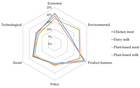 The largest differences in criteria weights are seen between animal-based and plant-based products (Figure 6). On average, products of animal origin show a better performance than products of plant origin in the following criteria: product features (weighted 3%–5% higher), economic (+2%–4%), technological (+1%–2%), and social (+1%–2%). On the contrary, plant-based products have a better performance than animal-based products under environmental (+7%–9%) and policy (1%–2%) criteria.