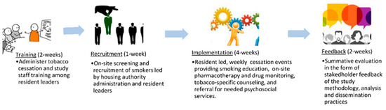 Our non-randomized, pre-post pilot utilizes three community-centric core elements: (a) durable and jointly linked community/academic infrastructure systems, (b) recognition and referral to local community-based organizations to address acute psychosocial stressors contributing to smoking behaviors, (c) strong on-site (public housing) residential leadership commitment to cessation improvement. We engaged resident, on-site leaders to be the public face of the intervention since traditional academic staff are unable to promote an intervention with equal potency among residents who identify at geographically granular levels. The resident leaders assisted in the design, implementation, and evaluation of the intervention. This is the first of at least three pilots seeking to refine the development of a public housing-centered smoking cessation program. We hypothesize that the 30-day quit rate will be higher in our joint academic–community led cessation program compared to the Maryland Quitline (the US state-based telephone/online tobacco cessation service in which the study occurred). The state quitline’s 30-day quit rate is reported at 27.9%. However, it must be recognized that this frequently referenced marker is based on a self-report [19]. This 30-day quit rate benchmark is similar to other US quitline programs [20]. We chose using the state quitline as the benchmark since it has been frequently promoted by local PHA sites as a means to enhance cessation [20]. We believe our comprehensive, wrap-around cessation programming that includes on-site smoking harm education, pharmacotherapy, and psychosocial/legal services will be able to enhance the likelihood of achieving high cessation rates
