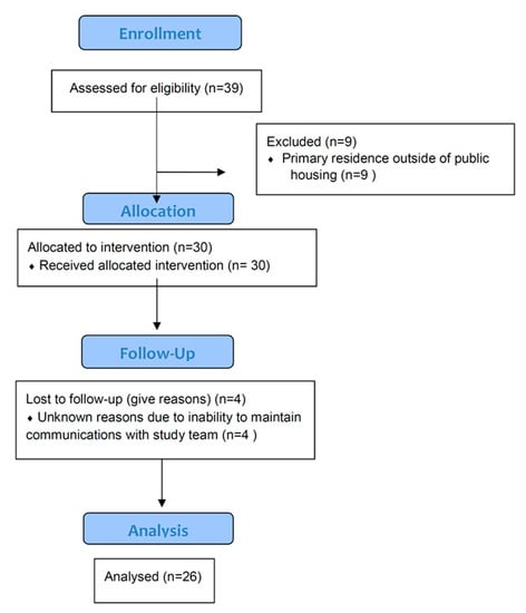 All resident leaders and academically affiliated research assistants demonstrated complete knowledge, with scores of 100%, on post-training examinations. Thirty-nine participants were recruited in two hours, but nine were excluded due to their residence outside of the public housing unit (Figure 2). Excluded participants reported that word-of-mouth conversations from public housing residents resulted in their attendance at the recruitment event. Among the 30 participants who were recruited, four participants were lost to follow-up and could not be contacted by phone to acquire the underlying reasons. Twenty-six participants had attended at least two study visits, including the final visit. Fourteen participants had attended at least three visits of which 10 participated in all sessions. Among the 26 recruited, 58% were female, African American and between the ages of 41–60 years of age (Table 1). Most participants initiated cigarette smoking in adolescence and did not engage in any cessation activity in the 12 months prior to the intervention.