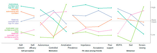 The five classes are shown in Figure 1; full details are given in Table S3. The Autonomous, Confident and High PA value class (19%) has high levels of autonomous relative to controlled motivation, very high levels of self-esteem and self-efficacy, and high value of physical activity among friends. The Relatively autonomous and Confident class (18%) have moderate autonomous motivation and very low controlled motivation, high levels of self-esteem and physical activity self-efficacy, and average to low value of physical activity among friends. The Relatively controlled and High PA value class (28%) has moderate-to-high quantity of motivation, but of mixed quality, consisting of higher controlled versus autonomous motivation, average self-esteem and self-efficacy and average to high value of physical activity among friends. The Relatively controlled, Low confidence and PA value class (23%) has lower quantity of motivation, with high levels of controlled relative to autonomous motivation and high amotivation, low self-esteem and physical activity self-efficacy and low value of physical activity among friends. The final Amotivated, Low confidence and PA value class (12%) has low autonomous and controlled motivation and high amotivation, low levels of self-esteem and physical activity self-efficacy and low value of physical activity among friends. Physical activity varied more within classes than between classes, with the two classes characterised by low confidence and low PA value having lower levels of MVPA on average, and the classes characterised by higher autonomous motivation and PA value having slightly higher levels. Screen-viewing was lowest in the Autonomous, Confident and High PA value class, and very high in the two classes characterised by low confidence and low PA value.