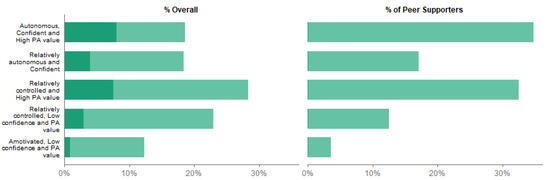 We estimated the proportion of girls in each class who were nominated as peer supporters. Figure 2 shows the distribution of all girls across the five classes (left) compared to the distribution of peer supporters in the five classes (right), and additionally the proportion of each class who were chosen as peer supporters (shaded area, left). While nearly half of the sample (47%) are in the mixed and autonomous motivation classes, two thirds of peer supporters (67%) are in these classes. The peer supporters are predominantly from the mixed and autonomous motivation, with only 7% from the Amotivated, Low confidence and PA value class but 42% from the Autonomous, Confident and High PA value class. In addition, there were differences in socioeconomic factors between latent classes (Table S3), with those in the Autonomous, Confident and High PA value class having a higher average family affluence scale than the Amotivated, Low confidence and PA value class (7.5 compared to 6.1), and substantially fewer pupils receiving free school meals (5% compared to 21%). The distribution of classes, and peer supporters within those classes, differed substantially between schools (Figure S1). Although there was considerable variation in school sample sizes (between 31 and 142), around half of schools (both large and small) had no peer supporters from the Amotivated, Low confidence and PA value class and a fifth had none from the Relatively controlled, Low confidence and PA value class.