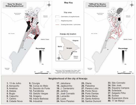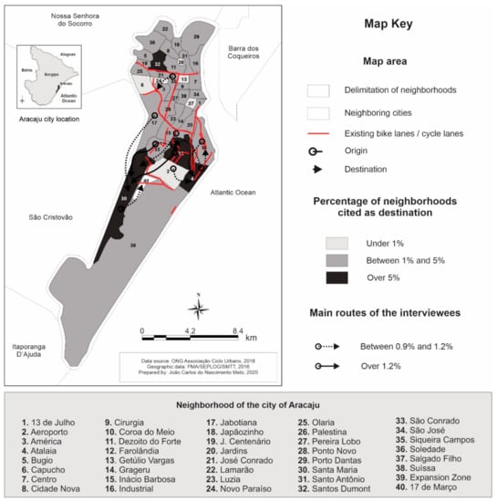 Descriptive information was presented using absolute and relative frequencies. To compare the profile of bicycle users with Aracaju’s population, we restricted the analysis to adult participants and used the information provided by the Brazilian 2013 National Health Survey, which is the closest survey to the reference year with representative information of the adult population of Aracaju [] (% and 95% confidence intervals). The perception analysis of cycling difficulty in neighborhoods was determined by the relative frequency of citations used (easy or difficult). Absolute frequencies of commuting between neighborhoods were used to verify the main trip origin and destination, and the main neighborhoods cited as the origin or destination. Main trip origins and destinations were defined as those representing at least 0.9% of the total mentioned. The Aracaju Mobility Master Plan (2016) was used to identify bike lanes that were implemented until 2015. Finally, the information was presented in the form of a map with an origin and destination analysis. It was carried out using a cross-reference table to check the main neighborhoods in which there was a greater flow of bicycle users entering and leaving, in addition to identifying the main trip origin and destination of the interviewees. The maps were built using the CorelDRAW Graphics Suite 2019 software (Corel Corporation, Ottawa, ON, Canada). All analyses were performed using SPSS 22.0 software (IBM, Armonk, NY, USA).