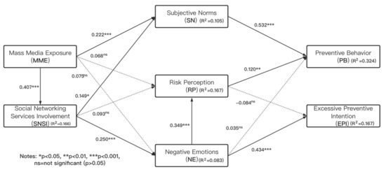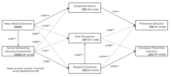 In the present study, the constructs were measured through adapted items that were derived from previous research and modified to meet the requirements of this study. All the items were presented in the in the Appendix in detail. Items were scored on a 1–7 Likert scale, with 1 referring to least frequent or strongly disagree and 7 most frequent or strongly agree. The respondents filled out questionnaires based on their own ideas and experience in the past month. Measurements for most of the constructs in the study followed previous studies. Mass media exposure and social networking services involvement were measured using items derived from Li [26]. Four items of risk perception were adopted from Cho and Lee [82]. The measurement of negative emotions was modified following the research of So, Kuang, and Cho [57], Lagoe and Atkin [83], and Zhang et al. [84]. Two typical negative emotions, fear, and anxiety, were measured through six items. Subjective norms were measured with the scale of descriptive norms used by Park and Smith [85]. Measuring preventive behavior against coronavirus disease was taken from six typical preventive measures officially recommended by the Chinese center for disease control and prevention. This is also the most authoritative guide for protective behaviors in the Chinese mainland. After completing the evaluation of their own preventive behaviors, the respondents were further asked whether they believed that the preventive measures were sufficient to provide enough protection so as to assess the respondents’ excessive preventive intention.