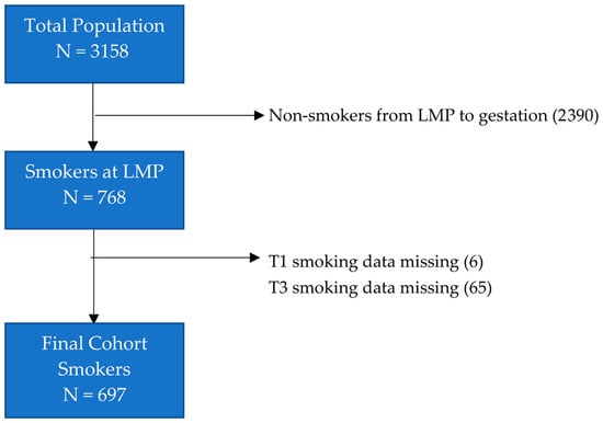 Of the 3158 women who became pregnant during the study period, 768 (24.3%) were smokers at the time of their last menstrual period. Following the removal of individuals for whom there was incomplete data on smoking (see Figure 1), 697 smokers (90.7%) were analysed.