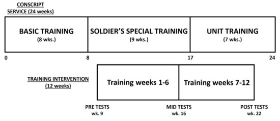 The study was implemented during the latter part of the Finnish conscript service, after the eight-week basic training period (Figure 1). Physical performance tests and simulated military task performance were repeated three times during the training study, in the ninth week (PRE), sixteenth week (MID), and twenty-second week (POST) of their conscript service. The testing began in the morning with body composition measurements. After breakfast, the subjects performed muscular power, strength, and strength endurance tests. Finally, after lunch they performed the simulated military task performance test. Each training group completed their tests during the same day.