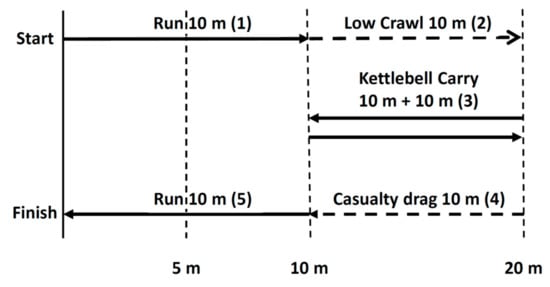 The simulated military task performance consisted of typical army soldier tasks and maneuvers, such as sprints, crawling, carrying objects, and casualty evacuation. It was performed inside on an artificial turf with soldiers wearing typical combat gear, including the helmet (total extra weight of 22-kg). From the starting (lying) supine position, the soldiers performed a 10 m sprint, followed by a 10 m low crawl. After the low crawl, the subjects lifted, carried, and lowered two 16-kg kettlebells (CompactFit Ltd., Helsinki, Finland) twice for a distance of 10 m taking a supine position when lowering the kettlebells. This was followed by a 75-kg sandbag drag (Rogue Sandbag, Rogue Fitness Europe Ltd., Pori, Finland) for 10 m, followed by a sprint of 10 m. The total length of the track was 60 m (Figure 2).