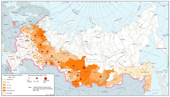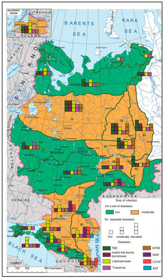 Malkhazova, S.; Pestina, P.; Prasolova, A.; Orlov, D. Emerging Natural Focal Infectious Diseases in Russia: A Medical–Geographical Study. Int. J. Environ. Res. Public Health 2020, 17, 8005. https://doi.org/10.3390/ijerph17218005