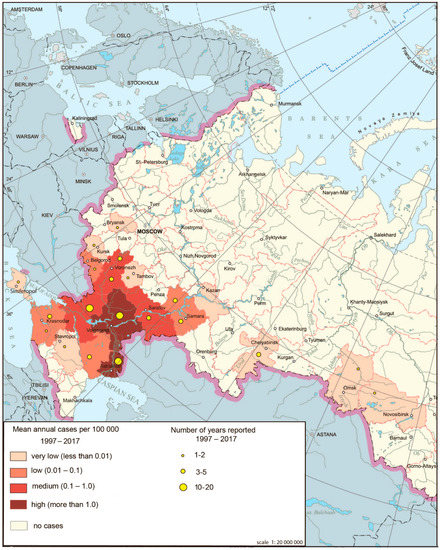 - Malkhazova, S.M.; Kotova, T.V.; Mironova, V.; Shartova, N.; Ryabova, N.V. Medico-Geographical Atlas of Russia “Natural Focal Diseases”, 2nd ed.; Faculty of Geography, Lomonosov Moscow State University: Moscow, Russia, 2017. [Google Scholar]