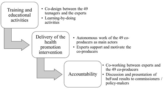 Given these premises, the paper presents the design, dynamics, and results of a co-production experience in Tuscany (Italy) called beFood. This was a public intervention of healthy lifestyle promotion conducted with adolescents for the early prevention of obesity and overweight [