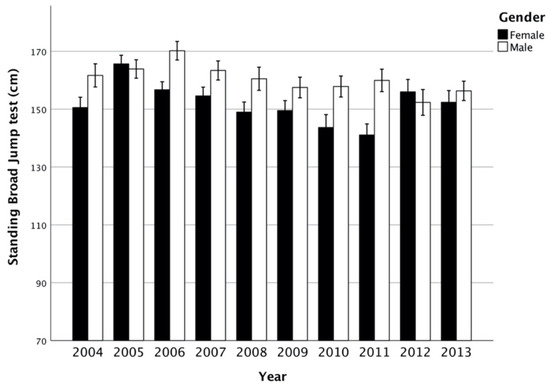 Standing broad jump test (cm; mean, interval CI 95%) between years per gender.