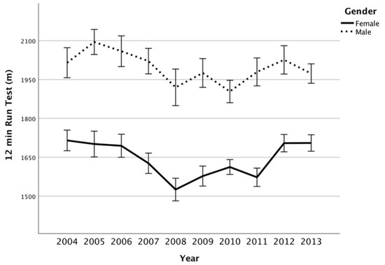 Cooper endurance run test (meters, mean, interval CI 95%) between years per gender.