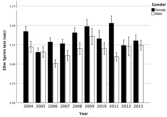 For this test, even if largely used in on-field contexts, no large datasets are unfortunately available. Over ten years, the overall performances remained stable, as also confirmed by the variance analysis (coefficient of variation = 0.08). In the timeframe 2006–2007, another Italian study from Gallotta et al. [54], reported corroborating results in the performances of SP-30: 6 s for males and females (pooled data). Other studies evaluating this test (Greece 1997 to 2007; Spain, 2001 to 2007; Germany 2007–2015) indicated a general improvement in speed performance while others (Lithuania 1992–2002; Portugal 1993–2013) declared a stagnation or results [45]. In a similar sprint test (50 m), Australian age-paired children run at the same speed (5.6 vs. 5.4 m/sec), according to a meta-analysis collected between 1985 and 2009 [43]. Thus, even this physical fitness dimension seems to remain constant.