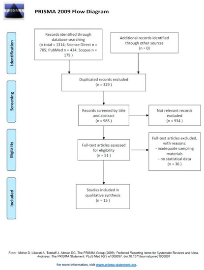 Our initial search produced 1314 potential literature references (Figure 1). We removed 329 duplicate full research articles; after an accurate review of the abstracts and titles of 985 full research articles, we screened 51 full research articles as eligible papers for the final quality evaluation. Of these, we excluded 36 for poor quality and/or insufficient data (e.g., inadequate sampling materials, no statistical data). Finally, we included 15 full research articles, in particular 4 from China, 3 from Spain, and 1 each for Canada, Denmark, Germany, Italy, Scotland, South Korea, Turkey, and USA (Table 1).