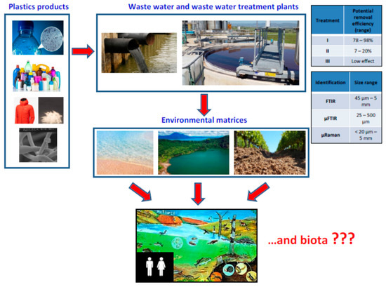 Over the years, the growing use and incorrect recycling of plastic have significantly increased the presence of this contaminant in all environmental matrices. Agricultural activities (e.g., use of fertilizers, greenhouse covers, etc.), illegal dumping of waste, and atmospheric deposition have a significant impact on soil, while fishing related activities, the illegal dumping of plastic waste, and wastewater treatment plants (WWTPs) have a significant impact on water. Several studies showed that wastewater treatment plants are a source of release of microplastics (MPs) into the aquatic and terrestrial environment, including after treatment [1,2,3]. So, through the sewage system, millions of microplastics pass through WWTP and the characteristics of microplastics depend on local agricultural, urban, and/or industrial activities. All microplastics that are not retained by WWTP will reach rivers and consequently, the oceans [2,4,5,6,7].