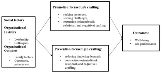 Accordingly, we argue that promotion-focused job crafting would be a salient mediating mechanism linking social factors and beneficial work outcomes. In this study, we categorize work outcomes into two aspects: employee performance and well-being, which are consistent with the general model of proactive behavior by Bindl and Parker []. These two are important indicators to measure employee work outcomes because they emphasize what employees achieve and how employees feel during the work. Prior studies showed that employee performance usually comprises task performance, creative performance, and extra-role performance; whereas employee well-being usually comprises job satisfaction, turnover intention, and thriving [,]. Following our theoretical reasoning so far, it is expected that social factors are positively related to job crafting, and subsequently, job crafting (particularly, promotion-focused job crafting) is positively related to work performance and well-being.