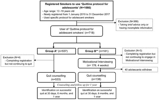 A retrospective comparative study was conducted based on the longitudinal follow up among adolescent smokers who voluntarily called and registered in Quitline for counseling to quit. As shown in Figure 1, 1086 adolescent smokers aged between 13 and 19 years, who newly registered in “Quitline protocol for adolescent smokers” from 1 January 2010, to 31 December 2017, were enrolled. After excluding 368 adolescent smokers who decided to receive brief advice only or had incomplete baseline information, 537 and 181 adolescent smokers voluntarily decided to participate in the 1-year quitting and maintenance counseling only (group A) and the additional 4-week motivational enhancement before 1-year quitting and maintenance counseling (group B), respectively. Adolescents self-selected the group based on their willingness and recommendations from quitting coaches after assessing their readiness to quit. Four and three adolescents in group A and group B who did not want to continue the cessation program were excluded, respectively. Forty adolescents of the 178 in group B withdrew their participation during the 4-week motivational enhancement. Finally, 533 and 138 adolescent smokers in group A and group B correspondingly decided to quit smoking and engaged in the 1-year quitting and maintenance protocol.