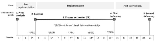 Based on the theoretical framework presented above, the H-WORK study design comprises three major phases: a pre-intervention phase, an implementation-intervention phase, and a post-intervention phase, which are shown in Figure 1. Data will be collected at five main time points, including (1) the need analysis, (2) the baseline data collection (i.e., pre-intervention), (3) the process evaluation (i.e., implementation phase), (4) the first follow-up data collection and (5) the second follow-up data collection (i.e., post-intervention phase). First, the needs analysis (i.e., pre-intervention phase) is aimed to gather insights into which needs line managers and workers have to ensure their mental health and psychological well-being. Based on the results from the needs analysis, specific, tailored and multilevel interventions will be selected and implemented (i.e., implementation-intervention phase). Subsequently, the baseline data collection (i.e., pre-intervention phase), the first follow-up data collection and, six months later, the second follow-up data collection (i.e., post-intervention phase) will be performed to evaluate the effectiveness of the implemented interventions in terms of outcomes (i.e., increased workers’ mental health). Throughout the implementation phase, process evaluation will be carried out before, during and at the end of the intervention, to evaluate the implemented interventions in terms of both improved working mechanisms, mental health and well-being [] and cost-effectiveness. More in detail (Figure 1), the process evaluation involves six measurement points: the first point at the baseline data collection point (i.e., pre-intervention phase, PE1), which captures the organisational context; the second point during the implementation phase (PE2), at the end of each activity, which collects how the participants perceived the intervention activity; the third, fourth and fifth point, every three months after the start of the implementation phase (PE3-PE4-PE5), to explore how the intervention activity is integrated into daily work practices and procedures or the extent to which the intervention activity is changing the way participants react cognitively or emotionally to the organisational reality; the sixth point, at the first follow-up data collection (PE6), is conducted exploring whether changes in mental health and well-being management can be observed at the IGLO level. Based on a mixed-method approach, while the measures are the same for all intervention sites at time points one (PE1) and six (PE6), the measures at time points two to five (PE2-PE5) are adapted to the intervention level.