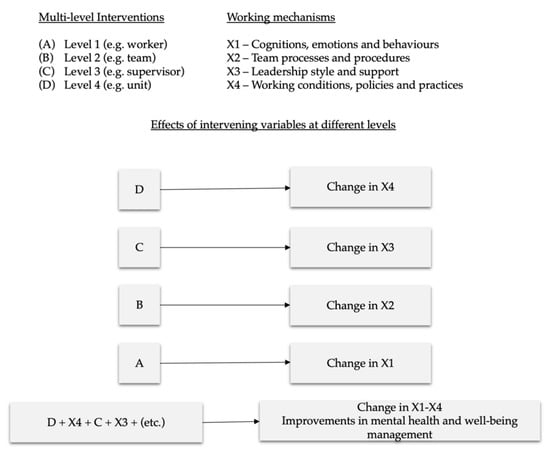 Traditionally, there has been a debate whether interventions targeting the individual or interventions taking a preventive approach to change working conditions are more effective, and literature reviews have focussed on comparing the two []. This approach has been criticised for comparing apples and oranges [] for several reasons. First, individual-level interventions target symptoms whereas organisation-level interventions target causes of poor health and well-being. Second, individual-level interventions target workers with identified problems whereas organisation-level interventions target the entire work population aiming at preventing poor well-being and mental ill-health. Third, individual-level interventions often focus on the immediate effects, namely, effects after three months [], whereas systems change in organisation-level interventions take longer to implement and to take effect, with follow-ups up to three years []. An integrative literature review [] concluded that multilevel interventions targeting both individuals and organisational practices and procedures were more effective than either individual-level or organisation-level interventions on their own. More recently, a meta-analysis [] exploring whether resources at the individual, group, leader and organisational level differed in their prediction of well-being and performance, found no such differences and argued that interventions should target all four levels.