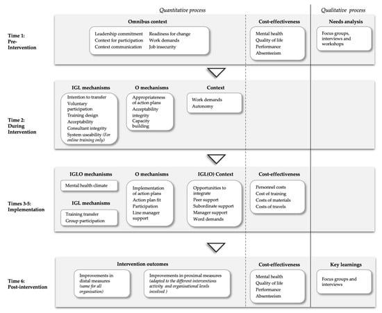 Any changes in these working mechanisms would lead together with improvements in the outcome of the multilevel interventions which is mental health and wellbeing. Indeed, as already highlighted by previous studies [,,,,,], more and more researchers are encouraging the use of statistical analysis capable of combining and linking process evaluation data with effect evaluation data in order to gauge the interactions of each of the intervention activity developed. In this sense, based on longitudinal approach, the use of multilevel regressions or (multi-group) structured equation models make it possible to include, for instance, knowledge on how participants reacted to intervention activities and contents, and, at the same time, process data closely related to the intervention attributes (e.g., participation, dropout) and to relate them to the expected outcomes (e.g., well-being). In this present research project, baseline levels act as context factors, process mechanisms as mediators linked to the outcomes (i.e., distal and proximal measures). Outcomes and process measures which will be adapted according to the type of interventions implemented as well as the levels of analysis involved (i.e., IGLO).