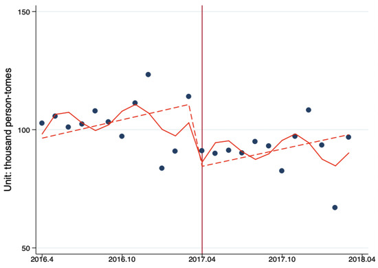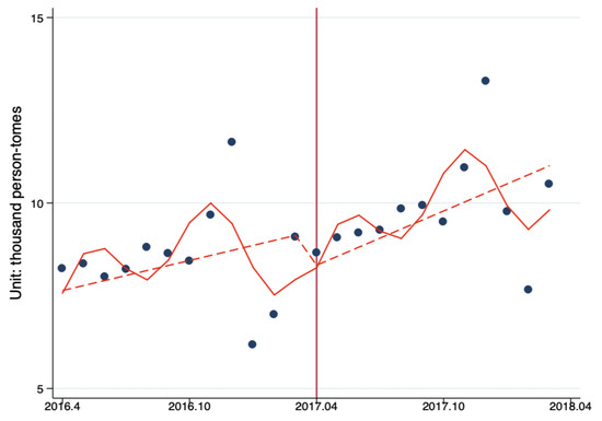 Interrupted time series analysis (ITS) was used to estimate the impacts of Beijing Reform on the level and trend changes in the monthly number of ambulatory care visits per primary healthcare institution by month. The results showed that after the reform, the number of ambulatory care visits decreased by 938.82 person-times (p = 0.58). The monthly ambulatory care visits before the reform was 135.19 person-times/months (p = 0.38); the reform had increased the monthly number outpatient visits by 108.46 person-times/month (p = 0.22). After the reform, the number of ambulatory care visits in PHC showed a significant upward trend (p < 0.10) (Figure 1, Table 5).