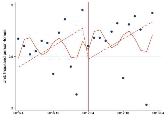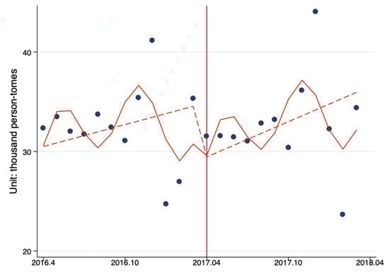 - Bernal, J.L.; Cummins, S.; Gasparrini, A. Interrupted time series regression for the evaluation of public health interventions: A tutorial. Int. J. Epidemiol. 2017, 46, 348–355. [Google Scholar] [CrossRef]