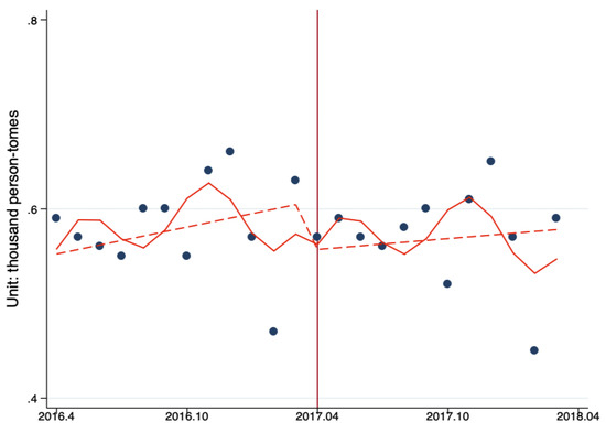 Figure 3 shows the ITS analysis of the impacts of Beijing Reform on the level and trend of changes in the monthly number of ambulatory care visits per tertiary hospital by month. The results showed that after the reform, the number of ambulatory care visits decreased by 27,423.35 person-times (p < 0.10); the monthly increase of ambulatory care visits before the reform was 1293.70 person-times/month (p = 0.33), and the monthly increase of ambulatory care visits after the reform decreased to 1215.50 person-times/month (p = 0.33); the reform had reduced the monthly increase of ambulatory care visits by 78.22 person-times/month (p = 0.92). This shows that the reform had a significant impact on the average number of ambulatory care visits per institution in Beijing’s tertiary hospitals (p < 0.10), leading to the average number of ambulatory care visits in tertiary hospitals reducing significantly (Figure 3, Table 5).