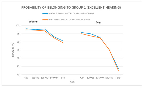 The aim of this study is to determine the combined influence of gender and family history of hearing problems variables in the development of hypoacusia. We see that in both women and men, the probabilities of belonging to the group with the best hearing (Group 1, no loss of hearing acuity) is higher for individuals who do not report a family history of hearing problems than for those who do (see Table 6). Once more, women in general have a higher probability of exhibiting good hearing than men, whether or not they report a family history of hearing problems. In fact, the probability of belonging to the group with the best possible hearing is 94.86% in the least favorable case for women (i.e., women with family history of hearing problems), versus 88.14% in the most favorable case for men,(i.e., men with no family history of hearing problems).
