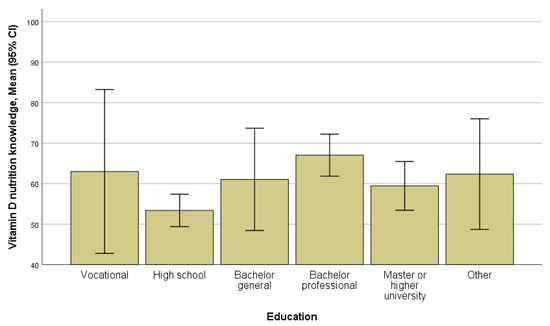 Scores for vitamin D nutrition knowledge in education groups (p = 0.014, ANOVA).