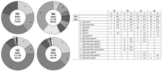 - Haga, H.J.; Palm, Ø.; Peen, E. Prevalence of IgA class antibodies to cyclic citrullinated peptide in patients with inflammatory bowel disease (IBD). Clin. Rheumatol. 2011, 30, 955–957. [Google Scholar] [CrossRef]