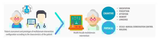 The Health Arcade project has designed to promote a change in geriatric patients’ routines during hospital stay by creating a favourable setting that will attract and motivate them for performing physical and cognitive activities to prevent iatrogenic nosocomial disability []. The main aim of this project is to validate the impact of a pilot-system of multidomain intervention (i.e., physical and cognitive training) using gamification technologies to improve patients’ functional abilities (Figure 1), while also encouraging personal motivation and internal locus of control, which have been shown to be predictive variables in health promotion [,,].
