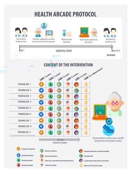 The intervention will consist in a supervised training including cognitive and physical stimulation using the games of the Health Arcade prototype (developed by OUIPLAY sl., Dundee, UK). This pilot-system is made up of a selection of technologies, such as movement detection through Near-Field Communication Sensors, wireless communication systems, feedback systems (i.e., LEDs and screens), and game engine programmes for the use of virtual reality. The games will focus on different cognitive domains such as orientation, perception, attention span, working memory, language, and coordination. The intervention duration will be four to nine consecutive days. Additionally, the patients will receive encouragement for maintaining active during hospital stay and for reducing sedentary time. The details of the intervention are described in the Figure 2 and Table 2.