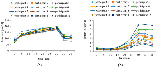 The individual heart rate data and lactate concentrations are shown in Figure 1. During the graded exercise test, the heart rates increased linearly. The participants had a maximum heart rate of 187.8 (SD: 9.9) beats per minute. Participants 2, 5, 6 and 12 reached their HRpeak. Three to six minutes after completion, the heart rates decreased towards the initial level during rest, but none of the participants reached resting heart rate.